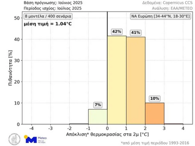 Θερμότερος του κανονικού αναμένεται να είναι ο ερχόμενος Ιούλιος στην ΝΑ Ευρώπη (συμπεριλαμβανομένης της Ελλάδας) σύμφωνα με τις μακροπρόθεσμες προγνώσεις που εκδόθηκαν μέσα στον Ιούνιο. Όπως φαίνεται στο παρακάτω γράφημα (Εικόνα 1), σύμφωνα με το 93% των διαθέσιμων σεναρίων η μέση θερμοκρασία Ιουλίου θα είναι υψηλότερη από τα κανονικά για την εποχή επίπεδα (περίοδος αναφοράς: 1993-2016). Συγκεκριμένα, η πιθανότητα για θετικές αποκλίσεις μεταξύ 0 και 1°C, μεταξύ 1 και 2°C και άνω των 2°C είναι 42%, 41% και 10% αντίστοιχα. Οι πιθανότητες για αρνητικές αποκλίσεις μεταξύ 0 και 1°C είναι 7%. Η μέση τιμή των 400 σεναρίων είναι +1.04°C. Όσον αφορά την ευρωπαϊκή ήπειρο συνολικά, ο χάρτης της Εικόνας 2 απεικονίζει την απόκλιση της θερμοκρασίας Ιουλίου με βάση την μέση τιμή των 400 σεναρίων. Όπως προκύπτει, θετικές αποκλίσεις αναμένονται σε όλη την ήπειρο, με τις μεγαλύτερες τιμές να εντοπίζονται σε κεντρική και ανατολική Ευρώπη.