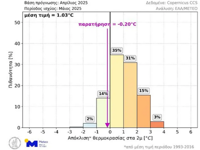 Όσον αφορά τον περασμένο Μάιο, η μέση θερμοκρασιακή απόκλιση στην ΝΑ Ευρώπη ήταν -0.20°C, ενώ η μέση τιμή όλων των σεναρίων της μακροπρόθεσμης πρόγνωσης που εκδόθηκε τον Απρίλιο του 2025 ήταν +1.03°C. Όπως φαίνεται στο παρακάτω γράφημα (Εικόνα 3), το μέγεθος της απόκλισης που παρατηρήθηκε είχε πιθανότητα 14% και ήταν το 4ο πιθανότερο πεδίο τιμών στην μακροπρόθεσμη πρόγνωση.