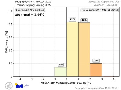 Όπως φαίνεται στο παρακάτω γράφημα (Εικόνα 1), σύμφωνα με το 93% των διαθέσιμων σεναρίων η μέση θερμοκρασία Ιουλίου θα είναι υψηλότερη από τα κανονικά για την εποχή επίπεδα (περίοδος αναφοράς: 1993-2016). Συγκεκριμένα, η πιθανότητα για θετικές αποκλίσεις μεταξύ 0 και 1°C, μεταξύ 1 και 2°C και άνω των 2°C είναι 42%, 41% και 10% αντίστοιχα. Οι πιθανότητες για αρνητικές αποκλίσεις μεταξύ 0 και 1°C είναι 7%. Η μέση τιμή των 400 σεναρίων είναι +1.04°C. Όσον αφορά την ευρωπαϊκή ήπειρο συνολικά, ο χάρτης της Εικόνας 2 απεικονίζει την απόκλιση της θερμοκρασίας Ιουλίου με βάση την μέση τιμή των 400 σεναρίων. Όπως προκύπτει, θετικές αποκλίσεις αναμένονται σε όλη την ήπειρο, με τις μεγαλύτερες τιμές να εντοπίζονται σε κεντρική και ανατολική Ευρώπη.