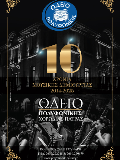 Εορτάζοντας τα 10 χρόνια Πολιτιστικής και Εκπαιδευτικής δημιουργίας (2014-2025), το ΩΔΕΙΟ της ΠΟΛΥΦΩΝΙΚΗΣ (Διεύθυνση: Γιώργος Μπουρδόπουλος, Διοικητική Διεύθυνση: Έφη Καββαδία), πραγματοποιεί μία ιδιαίτερη επετειακή συναυλία, την Κυριακή 22 Ιουνίου στις 8 το βράδυ, στην αίθουσα συναυλιών του Οργανισμού «Τόλης Νομικός» (Κορίνθου 280- Γούναρη).