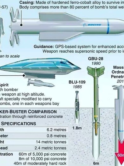 Το υπερόπλο που θεωρείται ότι είναι το μοναδικό που μπορεί να κρίνει την εξάλειψη του πυρηνικού προγράμματος του Ιράν είναι η πανίσχυρη διατρητική βόμβα GBU-57 που διαθέτουν οι ΗΠΑ.