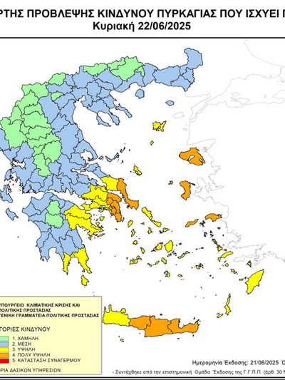 Πολύ υψηλός κίνδυνος πυρκαγιάς (κατηγορία κινδύνου 4) προβλέπεται αύριο σε Αττική καθώς και σε περιοχές της Στερεάς Ελλάδας, του Βορείου Αιγαίου και της Κρήτης, σύμφωνα με τον Χάρτη Πρόβλεψης Κινδύνου Πυρκαγιάς που εκδίδει η γενική γραμματεία Πολιτικής Προστασίας του υπουργείου Κλιματικής Κρίσης και Πολιτικής Προστασίας (civilprotection.gov.gr).