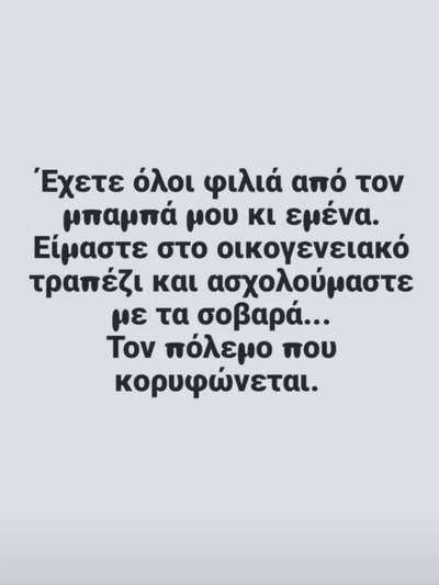 Χωρίς να αναφέρεται ευθέως στο περιστατικό, η Νατάσσα Μποφίλιου δημοσίευσε story, συνοδεύοντάς το με το εξής μήνυμα: «Έχετε όλοι φιλιά από τον μπαμπά μου κι εμένα. Είμαστε στο οικογενειακό τραπέζι και ασχολούμαστε με τα σοβαρά… Τον πόλεμο που κορυφώνεται».