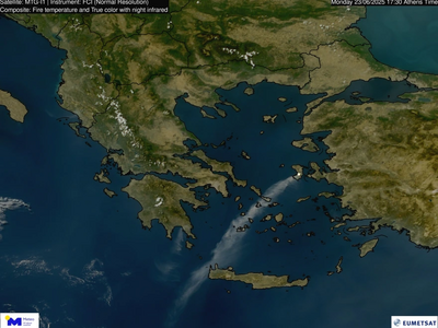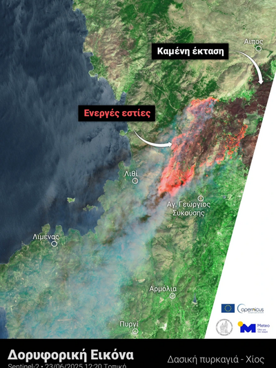 Το Εθνικό Αστεροσκοπείο Αθηνών, έδωσε στη δημοσιότητα δορυφορική αποτύπωση των καμένων εκτάσεων και των ενεργών εστιών φωτιάς στο νησί. Η δορυφορική αποτύπωση έγινε από τον ευρωπαϊκό δορυφόρο Sentinel-2 και δείχνουν την έκταση της καταστροφής στις 12:20 το μεσημέρι (τοπική ώρα) της Δευτέρας 23 Ιουνίου 2025.