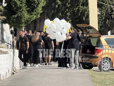 Οι φίλοι του ντυμένοι στα μαύρα και κρατώντας λευκά λουλούδια και μπαλόνια αποχαιρετούν τον Νίκο τους.