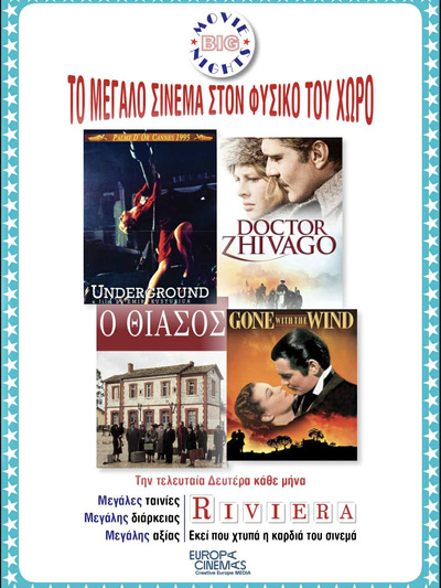 Και φέτος, την τελευταία Δευτέρα κάθε μήνα, από τον Ιούνιο έως και τον Σεπτέμβριο, στην νέα, μεγαλύτερη σινεμασκόπ οθόνη της και με πλήρως ανακαινισμένο ήχο Dolby Digital 5.1, το σινέ Ριβιέρα παρουσιάζει σε μοναδικές, ξεχωριστές προβολές, κλασικές ταινίες μεγάλης διάρκειας, οι οποίες κατά κανόνα βρίσκουν πολύ δύσκολα τον δρόμο τους για τις ελληνικές μεγάλες οθόνες.