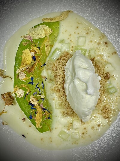 Για το στήσιμο: βάζουμε τη φέτα του πεπονιού, γαρνίρουμε με την κρέμα που έχει μέσα ψιλοκομμένο πεπόνι, προσθέτουμε το μπισκότο και τελειώνουμε με το παγωτό βανίλια και αποξηραμένα βρώσιμα φυλλα.