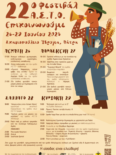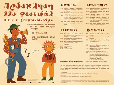 Η Περιφέρεια Δυτικής Ελλάδας συνδιοργανώνει με τον Αντιεφησυχαστικό Σύλλογο Τωρινών Ονειροπόλων - ΑΣΤΟ – Επικοινωνούμε, την 4ήμερη εκδήλωση- Φεστιβάλ με τίτλο «Θέρος – 22ο Φεστιβάλ Α.Σ.Τ.Ο. Επικοινωνούμε» που ξεκινά απόψε Πέμπτη 26 Ιουνίου και θα διαρκέσει μέχρι & την Κυριακή 29 Ιουνίου 2025 στο Σκαγιοπούλειο ίδρυμα στην οδό Σολωμού στην Πάτρα.