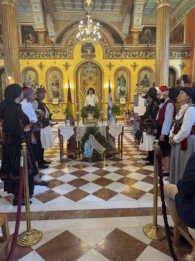 Στό μέσον τοῦ Ἱεροῦ Ναοῦ εἶχε τοποθετηθεῖ ἡ προσωπογραφία τοῦ Ὀδυσσέα Ἀνδρούτσου ἐπί ηὐτρεπισμένου τετραποδίου, τήν ὁποία πλαισίωναν μέλη τοῦ Ἀγήματος Ἱστορικῆς Ἀναβίωσης «Παναγιώτης Καρατζᾶς».