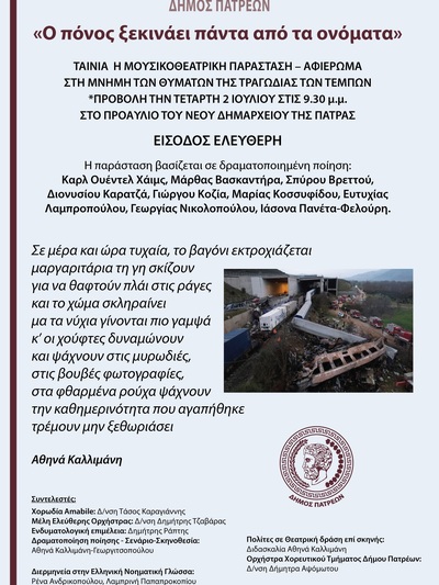 Την Τετάρτη 2-7-2025 στο προαύλιο του νέου Δημαρχείου στην Μαιζώνος & Γκότση - Πρόκειται για την κινηματογραφική μεταφορά της παράστασης- αφιέρωμα στη μνήμη των θυμάτων από την τραγωδία στα Τέμπη