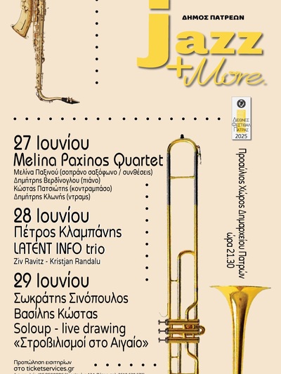 Συνθέσεις που αποτελούν έναν συνδυασμό μοντέρνας jazz με ελληνικά μουσικά στοιχεία, odd meters, μελωδίες και groove θα αποτελέσουν το κυρίαρχο στοιχείο στην πρεμιέρα της ενότητας jazz+more, η οποία ξεκινά στις 9.30 το βράδυ την Παρασκευή 27 Ιουνίου 2025 στον αίθριο χώρο του νέου Δημαρχείου της Πάτρας.