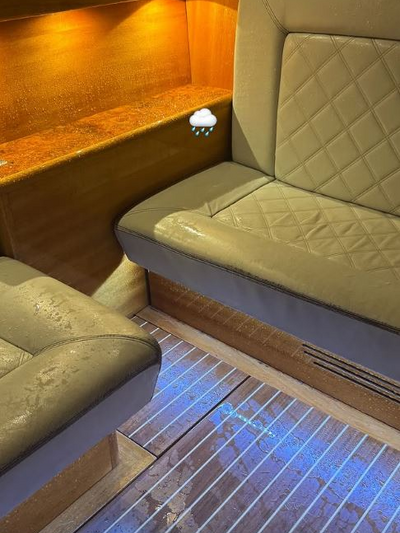 Η μέλλουσα νύφη, Λόρεν Σάντσεζ, κατέφτασε στην προβλήτα συνοδευόμενη από άνδρες με σμόκιν που κρατούσαν μπλε ομπρέλες πάνω της, προκειμένου να την προστατεύσουν από τη βροχή όσο επιβιβαζόταν στο σκάφος της.