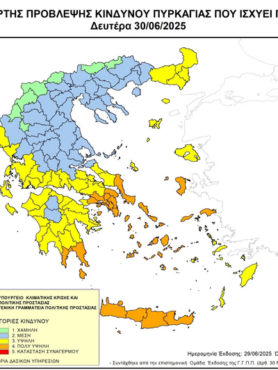 Σύμφωνα με το Χάρτη Πρόβλεψης Κίνδυνος Πυρκαγιάς που εκδίδει η Γενική Γραμματεία Πολιτικής Προστασίας του Υπουργείου Κλιματικής Κρίσης & Πολιτικής Προστασίας (civilprotection.gov.gr), για την Δευτέρα 30 Ιουνίου 2025, προβλέπεται πολύ υψηλός κίνδυνος πυρκαγιάς (κατηγορία κινδύνου 4) για τις εξής περιοχές: