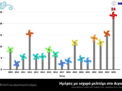 Το διάγραμμα που ακολουθεί παρουσιάζει τις ημέρες με ισχυρό μελτέμι στο Αιγαίο για το μήνα Ιούνιο των ετών 2009-2025. Ως κριτήριο για τον χαρακτηρισμό της ημέρας τέθηκε το όριο των 50 km/h ως μέγιστη ριπή ανέμου στο σταθμό του Ε.Α.Α / meteo.gr στην Τήνο-Δημαρχείο.