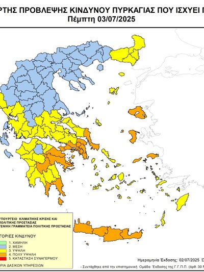 Σύμφωνα με το Χάρτη Πρόβλεψης Κινδύνου Πυρκαγιάς που εκδίδει η Γενική Γραμματεία Πολιτικής Προστασίας του Υπουργείου Κλιματικής Κρίσης & Πολιτικής Προστασίας (civilprotection.gov.gr), για σήμερα Πέμπτη 3 Ιουλίου 2025, προβλέπεται πολύ υψηλός κίνδυνος πυρκαγιάς (κατηγορία κινδύνου 4) για πέντε περιοχές,