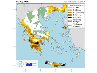 Το meteo του Εθνικού Αστεροσκοπείου Αθηνών μελέτησε τους δείκτες ξηρασίας στην Ελλάδα την 1η Ιουλίου 2025. Όπως προκύπτει, μεγάλο μέρος της Κρήτης, της Πελοποννήσου, της δυτικής Στερεάς Ελλάδας και της Θράκης βρίσκονται σε συνθήκες ξηρασίας. Από έντονη ή ακραία ξηρασία (επίπεδα 4 και 5) πλήττονται αρκετές περιοχές στους νομούς Χανίων, Ηρακλείου, Λασιθίου, Αρκαδίας, Αργολίδας, Μεσσηνίας, Ηλείας και Λέσβου.