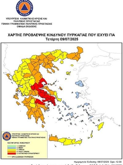 Εξαιρετικά σοβαρή χαρακτηρίζεται η Τετάρτη (9/7/25) σύμφωνα με τον επίσημο Χάρτη Πρόβλεψης Κινδύνου που δημοσιοποίησε η Γενική Γραμματεία Πολιτικής Προστασίας, αφού σε κατάσταση συναγερμού θα βρίσκονται πολλές περιοχές της χώρας, με κατηγορία κινδύνου 5, με ακραίες συνθήκες φωτιάς.