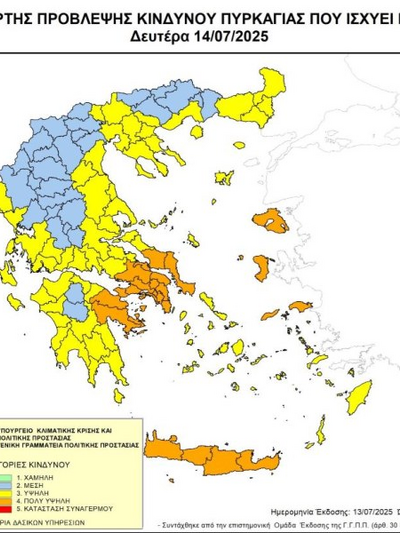 Πολύ υψηλός Κίνδυνος Πυρκαγιάς (κατηγορία κινδύνου 4) προβλέπεται για σήμερα Δευτέρα 14 Ιουλίου σε αρκετές περιοχές της χώρας, σύμφωνα με τον Χάρτη Πρόβλεψης Κινδύνου Πυρκαγιάς που εκδίδει η γενική γραμματεία Πολιτικής Προστασίας του υπουργείου Κλιματικής Κρίσης & Πολιτικής Προστασίας (civilprotection.gov.gr).