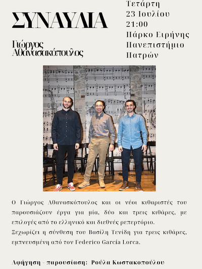 Με γνώμονα την αγάπη για την μουσική ο συνθέτης - κιθαριστής Γιώργος Αθανασακόπουλος και οι νέοι κιθαριστές του παρουσιάζουν, την Τετάρτη 23 Ιουλίου στις 9 το βράδυ, στη δροσιά του Πάρκου Ειρήνης του Πανεπιστημίου Πατρών, έργα για μία, δύο και τρεις κιθάρες, από το ελληνικό και διεθνές ρεπερτόριο.