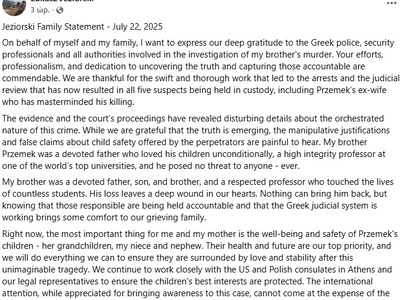 Αυτή τη στιγμή, το πιο σημαντικό για εμένα και τη μητέρα μου είναι η ευημερία και η ασφάλεια των παιδιών του Przemek — των εγγονών της, της ανιψιάς και του ανιψιού μου. Η υγεία και το μέλλον τους είναι η απόλυτη προτεραιότητά μας, και θα κάνουμε ό,τι περνά από το χέρι μας για να διασφαλίσουμε ότι θα μεγαλώσουν με αγάπη και σταθερότητα, μετά από αυτήν την αδιανόητη τραγωδία. Συνεχίζουμε να συνεργαζόμαστε στενά με τα προξενεία των ΗΠΑ και της Πολωνίας στην Αθήνα, καθώς και με τους νομικούς μας εκπροσώπους, ώστε να προστατευτούν τα καλύτερα συμφέροντα των παιδιών.