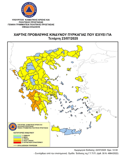 Πολύ υψηλή κατηγορία κινδύνου ( 4) προβλέπει ή Γενική Γραμματεία Πολιτικής Προστασίας σε περιοχές της Περιφέρειας Δυτικής Ελλάδας και ιδιαίτερα στις ΠΕ Αχαΐας , Ηλείας, όπως φαίνεται στον επισυναπτόμενο ημερήσιο Χάρτη Πρόβλεψης Κινδύνου Πυρκαγιάς για την Τετάρτη 23/07/2025.