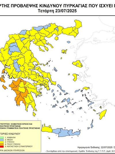 Πολύ υψηλή κατηγορία κινδύνου ( 4) προβλέπει ή Γενική Γραμματεία Πολιτικής Προστασίας σε περιοχές της Περιφέρειας Δυτικής Ελλάδας και ιδιαίτερα στις ΠΕ Αχαΐας , Ηλείας, όπως φαίνεται στον επισυναπτόμενο ημερήσιο Χάρτη Πρόβλεψης Κινδύνου Πυρκαγιάς για την Τετάρτη 23/07/2025. Εφιστάται η προσοχή στους πολίτες να είναι προσεκτικοί και να αποφεύγουν ενέργειες που μπορούν να προκαλέσουν πυρκαγιά από αμέλεια