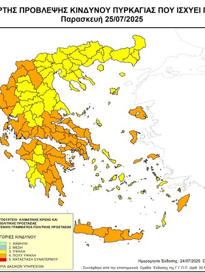 Πολύ υψηλή κατηγορία κινδύνου ( 4) προβλέπει ή Γενική Γραμματεία Πολιτικής Προστασίας σε ολόκληρη την Περιφέρεια Δυτικής Ελλάδας, όπως φαίνεται στον επισυναπτόμενο ημερήσιο Χάρτη Πρόβλεψης Κινδύνου Πυρκαγιάς για την Παρασκευή 25/07/2025. Εφιστάται η προσοχή στους πολίτες να είναι προσεκτικοί και να αποφεύγουν ενέργειες που μπορούν να προκαλέσουν πυρκαγιά από αμέλεια