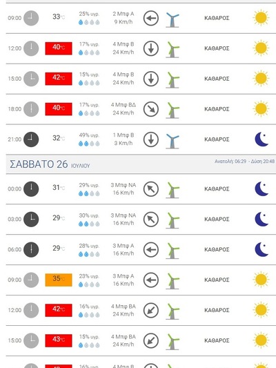 α) στα ηπειρωτικά τους 40 με 42 και στα δυτικά τους 43 με 44 βαθμούς Κελσίου. Στην Αθήνα τους 41 με 42 και στη Θεσσαλονίκη τους 38 με 39 βαθμούς.