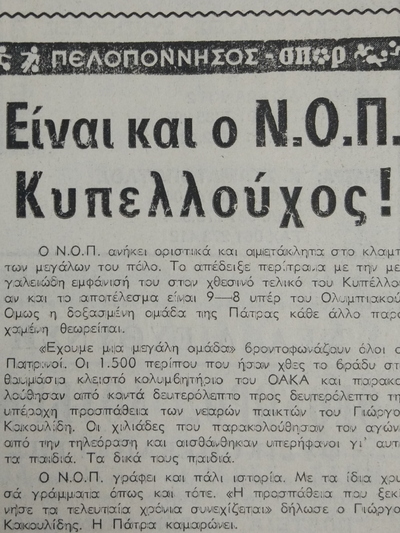 Και να, που φέτος ο Ν.Ο.Π. γύρισε την ιστορία πολλά χρόνια πίσω. Ο γίγαντας της Πάτρας ξύπνησε και άρχισε να «βρυχάται». Η Πάτρα βρίσκει πάλι το καμάρι της, την ιστορία της. Όχι, δεν είναι καθόλου υπερβολή! Όποιοι ξέρουν ποιος ήταν ο Ν.Ο.Π. την 15ετία 1935 - 1950, καταλαβαίνουν. Και οι υπόλοιποι, αυτοί που απλά έχουν ακούσει για τα κατορθώματα και τους άθλους εκείνης της ομάδας, "τρέχουν" τώρα να γευτούν κι αυτοί το νέκταρ αυτής της χαράς.