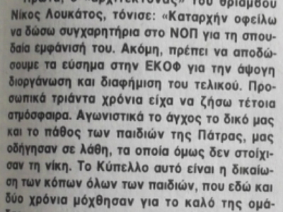 «Τούτη τη μέρα την περίμενε πολλά χρόνια η Πάτρα. Σαράντα δύο ολόκληρα χρόνια το πιο μεγάλο «καμάρι», ο Ν.Ο.Π. είχε πέσει σε λήθαργο, ήταν το 1950 η τελευταία φορά που ο Ν.Ο.Π. ήταν ο «πρώτος του αφρού», πρωταθλητής Ελλάδος. Μετά από μερικά χρόνια η Πάτρα φάνηκε να χάνει το πιο χρυσό "παιδί"της. Αυτό που της είχε χαρίσει στιγμές μοναδικές, ανεπανάληπτες.