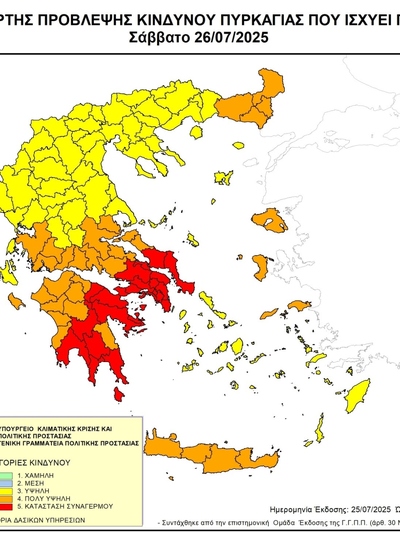 Σε κατάσταση συναγερμού τίθεται για αύριο η χώρα, λόγω του ακραίου κινδύνου εκδήλωσης πυρκαγιάς (κατηγορία κινδύνου 5) σε οκτώ περιοχές.