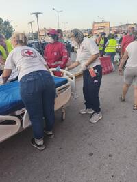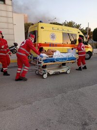 Εθελοντές του Ερυθρού Σταυρού συνδράμουν στην εκκένωση κλινικών του Γενικού Νοσοκομείου Πατρών Άγιος Ανδρέας μετά τη φωτιά που εκδηλώθηκε το απόγευμα.