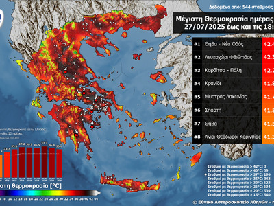 Στον χάρτη του meteo.gr/ ΕΑΑ που επισυνάπτεται παρουσιάζεται η κατανομή της μέγιστης θερμοκρασίας στη χώρα καθώς και οι 8 σταθμοί με τις υψηλότερες μέγιστες. Οι λευκοί κύκλοι υποδηλώνουν τους σταθμούς όπου η μέγιστη τιμή θερμοκρασίας ξεπέρασε τους 37 °C.