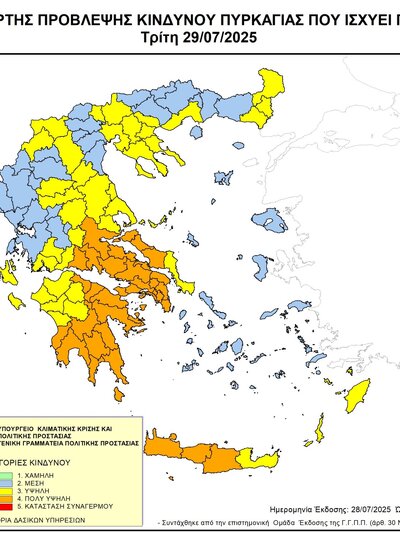 Πολύ υψηλή κατηγορία κινδύνου ( 4) προβλέπει ή Γενική Γραμματεία Πολιτικής Προστασίας σε περιοχές της Δυτικής Ελλάδας και ιδιαίτερα στην ΠΕ Αχαΐας, όπως φαίνεται στον επισυναπτόμενο ημερήσιο Χάρτη Πρόβλεψης Κινδύνου Πυρκαγιάς για την Τρίτη 29/07/2025.