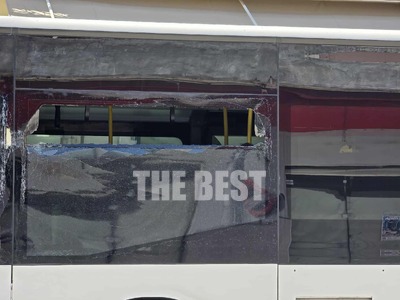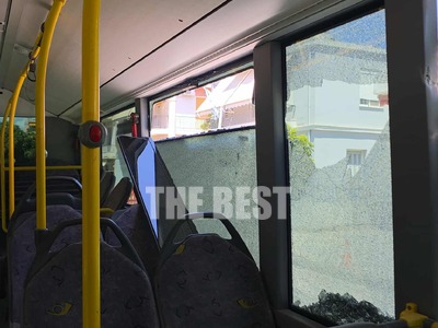 Από τη σύγκρουση έσπασαν τζάμια του λεωφορείου, με αποτέλεσμα θραύσματα να πέσουν και στο εσωτερικό του λεωφορείου, πάνω στις θέσεις των επιβατών.