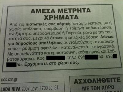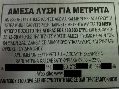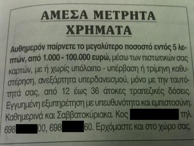 Ερωτηματικά προκαλούν οι δεκάδες αγγελίες που δημοσιεύονται πλέον στο τοπικό και όχι μόνο τύπο, με τηλέφωνα και ονόματα ανθρώπων που είναι πρόθυμοι να μας δανείσουν από 1.000 έως 100.000 ευρώ, ανεξάρτητα εάν είμαστε καταχρεωμένοι στις τράπεζες, με κάρτες σε καθυστέρηση και με εγγραφή στον Τειρεσία. Μάλιστα η επιχείρηση για την διευκόλυνσή μας λειτουργεί όλη την ημέρα, από το πρωί, ακόμα και τα Σαββατοκύριακα.