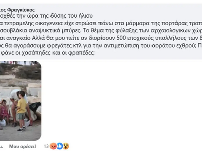 Παράλληλα, δεύτερη εικόνα που έχει προσθέσει στην ανάρτηση άλλος πολίτης, δείχνει οικογένεια να κάθεται πάνω στα αρχαία μάρμαρα και να τρώει σουβλάκια και πατατάκια, μετατρέποντας το μνημείο σε χώρο πικ-νικ.