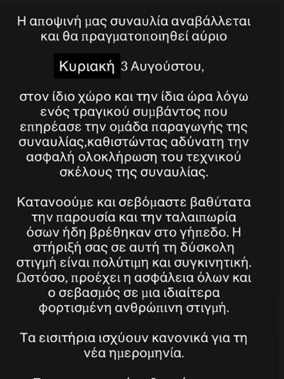 «Η αποψινή μας συναυλία αναβάλλεται και θα πραγματοποιηθεί αύριο, Κυριακή 3 Αυγούστου στον ίδιο χώρο και την ίδια ώρα, λόγω ενός τραγικού συμβάντος που επηρεάζει την ομάδα παραγωγής της συναυλίας, καθιστώντας αδύνατη την ασφαλή ολοκλήρωση του τεχνικού σκέλους της συναυλίας. Κατανοούμε και σεβόμαστε βαθύτατα την παρουσία και την ταλαιπωρία όσων ήδη βρέθηκαν στο γήπεδο. Η στήριξή σας σε αυτή τη δύσκολη στιγμή είναι πολύτιμη και συγκινητική. Ωστόσο, προέχει η ασφάλεια όλων και ο σεβασμός σε μία ιδιαίτερα φορτισμένη ανθρώπινη στιγμή. Τα εισιτήρια ισχύουν κανονικά για την νέα ημερομηνία. Σας ευχαριστούμε θερμά για την κατανόηση και την συμπαράσταση σας», ανέφερε ο τραγουδιστής.