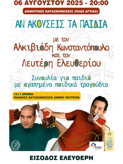 Στη συναυλία με τίτλο «Αν ακούσεις τα παιδιά», συμμετέχουν ο μουσικός και ερμηνευτής Αλκιβιάδης Κωνσταντόπουλος και ο ηθοποιός Λευτέρης Ελευθερίου. Η εκδήλωση πραγματοποιείται σε συνεργασία με τον ΚΟΔΗΠ, με αφορμή τη συμπλήρωση 10+1 χρόνων λειτουργίας των Ημερήσιων Παιδικών Κατασκηνώσεων του Δήμου Πατρέων.