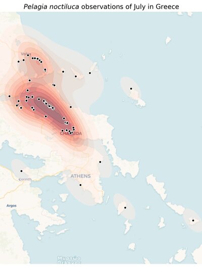 Το Παρατηρητήριο δημοσίευσε και χάρτες με επιβεβαιωμένες καταγραφές μωβ μεδουσών τον Ιούλιο στην Ελλάδα. Οι μαύρες κουκίδες στον χάρτη δείχνουν τις επιβεβαιωμένες καταγραφές του Ιουλίου. Η κόκκινη σκίαση απεικονίζει την εξάπλωσή τους: όσο πιο έντονη είναι η απόχρωση, τόσο πιο συχνή και σοβαρή είναι η παρουσία τους. Οι περιοχές με απαλό κόκκινο έχουν μεμονωμένα ή περιστασιακά περιστατικά, που αλλάζουν ανάλογα με τα θαλάσσια ρεύματα.