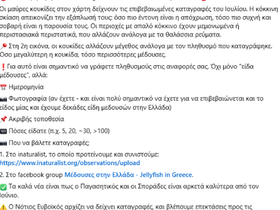 Το Ελληνικό Παρατηρητήριο Βιοποικιλότητας αναφέρει πως καταγραφές μωβ μεδουσών μέσα στον Ιούλιο άρχισαν στον νότιο Ευβοϊκό ενώ «βλέπουμε επεκτάσεις προς τις Κυκλάδες και τον Κορινθιακό». Τα καλά νέα είναι «πως ο Παγασητικός και οι Σποράδες είναι αρκετά καλύτερα από τον Ιούνιο».