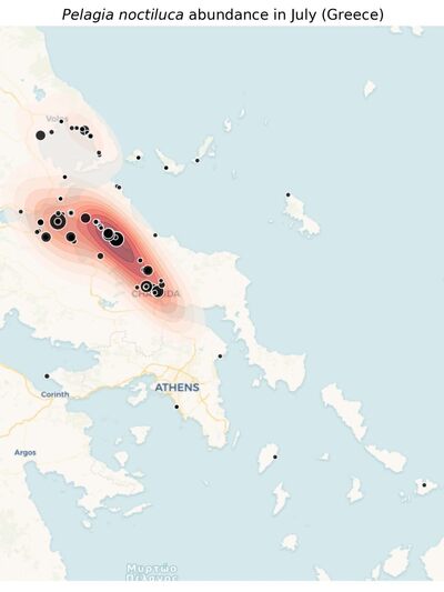Στον χάρτη που ακολουθεί, οι κουκίδες αλλάζουν μέγεθος ανάλογα με τον πληθυσμό που καταγράφηκε - όσο μεγαλύτερη η κουκίδα, τόσο περισσότερες μέδουσες: