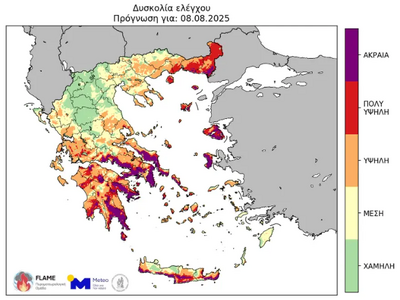 Στην παρακάτω ομάδα χαρτών παρουσιάζεται η εκτιμωμένη δυσκολία ελέγχου σύμφωνα με το Καναδικό Σύστημα Πυρομετεωρολογικών Δεικτών (Canadian Forest Fire Weather Index System – CFFWIS), προσαρμοσμένο στο πυρικό περιβάλλον της Ελλάδας κατά τη διάρκεια της Πέμπτης 07/08 και Παρασκευής 08/08/2025.
