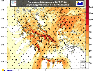 Σύμφωνα με τα διαθέσιμα προγνωστικά στοιχεία, την Παρασκευή 08/08 αναμένεται περαιτέρω ενίσχυση των βορείων ανέμων, με τις ριπές τους σε Ανατολική Στερεά, Νότια Εύβοια, Κυκλάδες και τοπικά στη Νότια Κρήτη να φτάνουν τα 100 km/h, όπως ευδιάκριτα αποτυπώνεται στον παρακάτω Χάρτη 1.