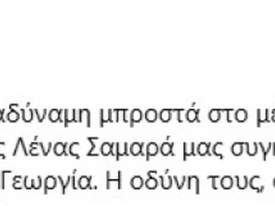 Παράλληλα, η υπουργός Εργασίας, Νίκη Κεραμέως υπογράμμισε: «Δεν υπάρχουν λόγια. Η αιφνίδια απώλεια της Λένας Σαμαρά μας έχει συγκλονίσει όλους. Ένα νέο κορίτσι γεμάτο ζωή… Όλες μας οι σκέψεις με τον Αντώνη, την Γεωργία, τον Κώστα».