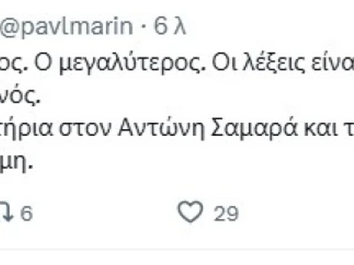 Από την πλευρά του, ο κυβερνητικός εκπρόσωπος, Παύλος Μαρινάκης έγραψε: «Αβάσταχτος ο πόνος. Ο μεγαλύτερος. Οι λέξεις είναι φτωχές μπροστά σε ένα τόσο τραγικό γεγονός. Ειλικρινή συλλυπητήρια στον Αντώνη Σαμαρά και την οικογένειά του. Κουράγιο και δύναμη».