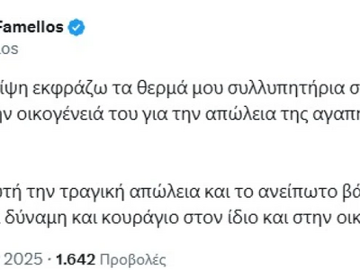 Την ίδια ώρα, ο πρόεδρος του ΣΥΡΙΖΑ, Σωκράτης Φάμελλος έγραψε: «Με ειλικρινή θλίψη εκφράζω τα θερμά μου συλλυπητήρια στον Αντώνη Σαμαρά και στην οικογένειά του για την απώλεια της αγαπημένης τους κόρης, Λένας. Μπροστά σε αυτή την τραγική απώλεια και το ανείπωτο βάρος για τους γονείς, εύχομαι δύναμη και κουράγιο στον ίδιο και στην οικογένεια του».