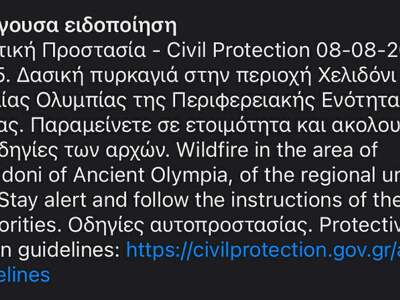 Μήνυμα από το 112 έλαβαν οι κάτοικοι των περιοχών Πελόπιο, Καυκωνία και Πλάτανος, καλώντας τους να παραμείνουν σε ετοιμότητα και να ακολουθούν τις οδηγίες των αρχών.