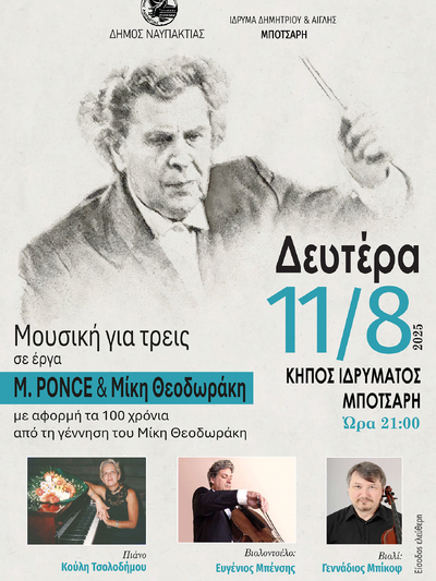 Στο πλαίσιο των εκδηλώσεων του Δήμου Ναυπακτίας για το Καλοκαίρι του 2025, και με αφορμή τη συμπλήρωση των 100 χρόνων από τη γέννηση του οικουμενικού μας μουσικού δημιουργού Μίκη Θεοδωράκη, παρουσιάζεται στον Κήπο του Αρχοντικού Μπότσαρη (Ιδρύματος Δημητρίου και Αίγλης Μπότσαρη), την Δευτέρα 11 Αυγούστου 2025 και ώρα 21:00, η μουσική εκδήλωση «Μουσική για Τρεις» με έργα M. PONCE και Μίκη Θεοδωράκη.
