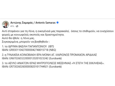 Να βοηθηθούν κοινωφελή ιδρύματα, αντί για στεφάνια για τη Λένα, παρακαλεί η οικογένεια του Αντώνη και της Γεωργίας Σαμαρά. Ειδικότερα, σε ανάρτηση στο προφίλ του πρώην πρωθυπουργού στο facebook αναφέρεται: